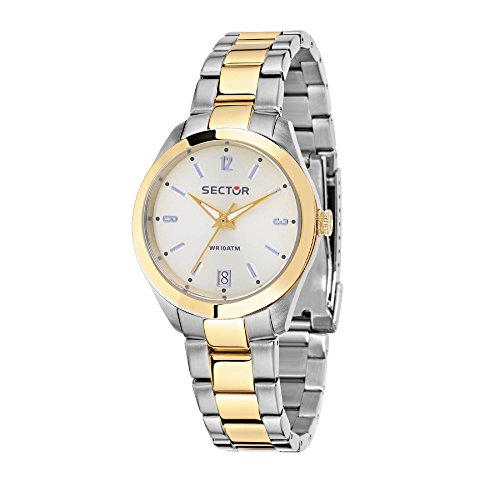 Orologio Sector da donna con movimento VJ32B12L e funzione tempo e data. La cassa in acciaio misura 31,5×38 mm e monta un vetro minerale. Quadrante sunray oro giallo, cinturino argento e oro con chiusura con fibbia deployante. Resistente all’acqua fino a 10 atm.